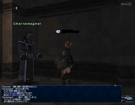 チョコガールの近くにいる、いつもの青装束のエルヴァーンから